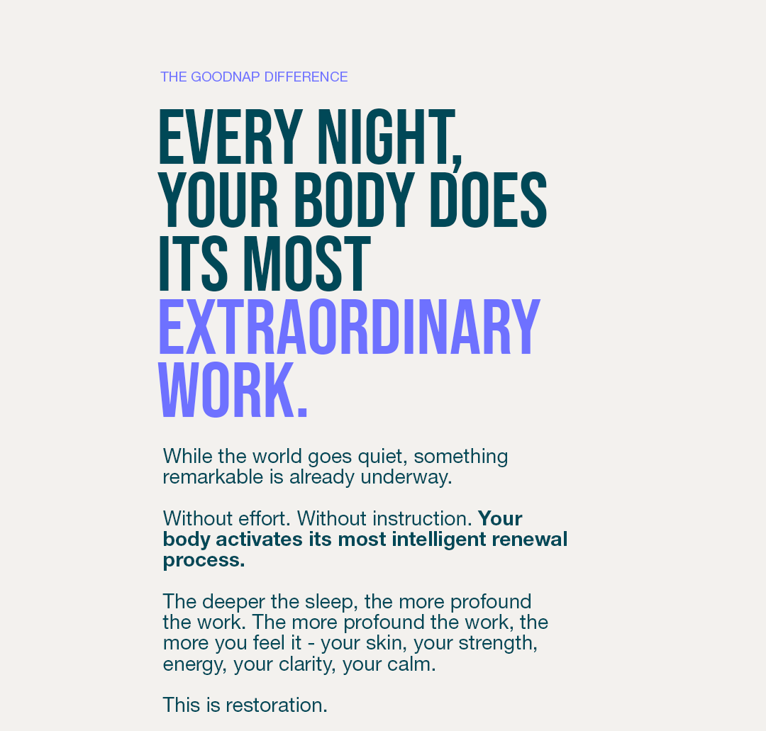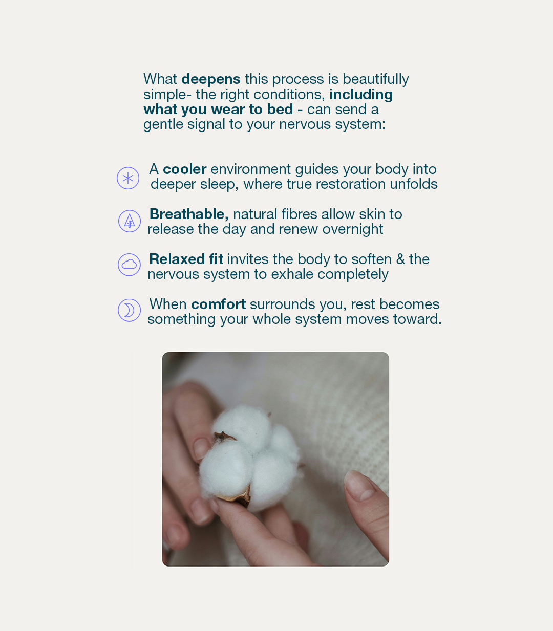 Deeply considered design to help your body relax fully and rest deeply. Crafted to move with your body through the night without restriction - allowing your nervous system to fully unwind and your body to settle completely into restorative sleep.